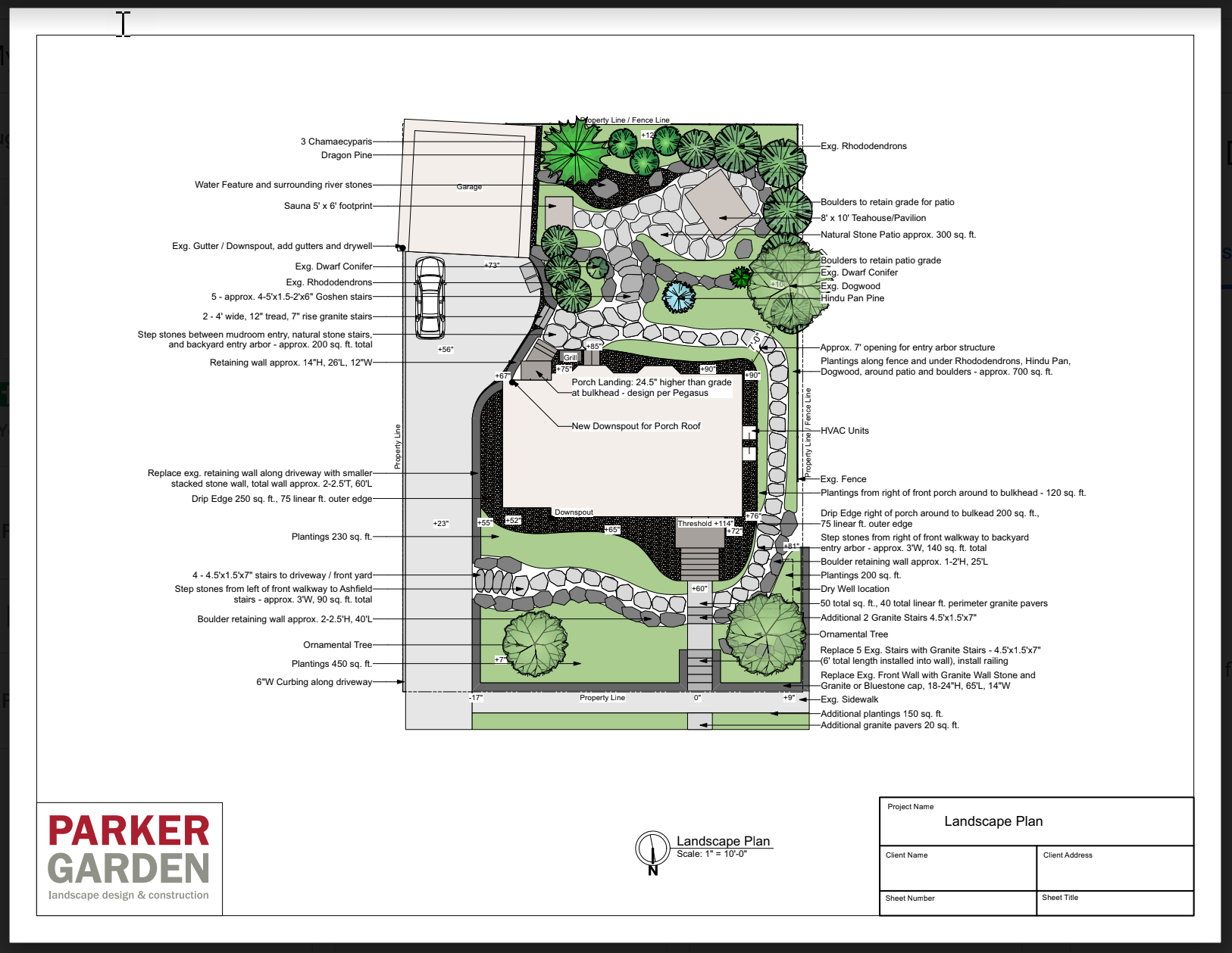 Our design work usually starts around $5,000. This includes multiple visits to the property, meetings to discuss the overall project scope, design layout, and material selection, collecting all site info including measurements, grades, photos, etc., providing detailed plan view and 3D images to convey all aspects of the project, and projecting out the costs for installation. The design cost is a contracted project, separate from the installation costs.